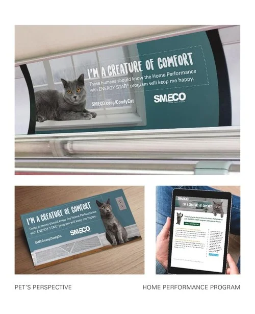 Those in the know call it SMECO. Our team sold the energy utility co-op on the idea of creating a cohesive annual campaign instead of separate, unlinked, seasonal pieces. I worked to create the concept and copy for our “Pet’s Perspective” spec campaign to promote SMECO’s energy- and cost-saving programs for its customer-members. Still working on getting the client to change “customer-members” to “customers."
