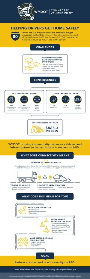 We developed content to educate state transportation departments about the new connected vehicle pilot program in Wyoming. I created copy for their new website and infographic, and scripted an overview video. I was able to take extremely technical program details and transform their messaging into clear and compelling information. States can now see how beneficial a program like this is for their economy and and infrastructure.